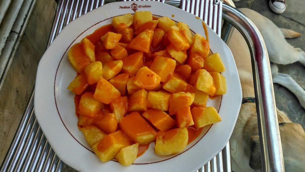 Patatas perfectas, cocidas en su punto y con una ración bien generosa. La salsa es suavecita, quizás demasiado suave, pero están ricas. Merece la pena la visita a El Tolmo.