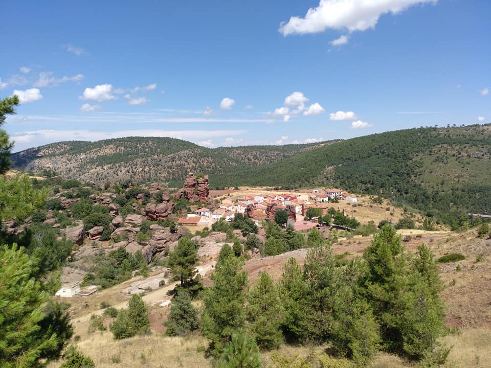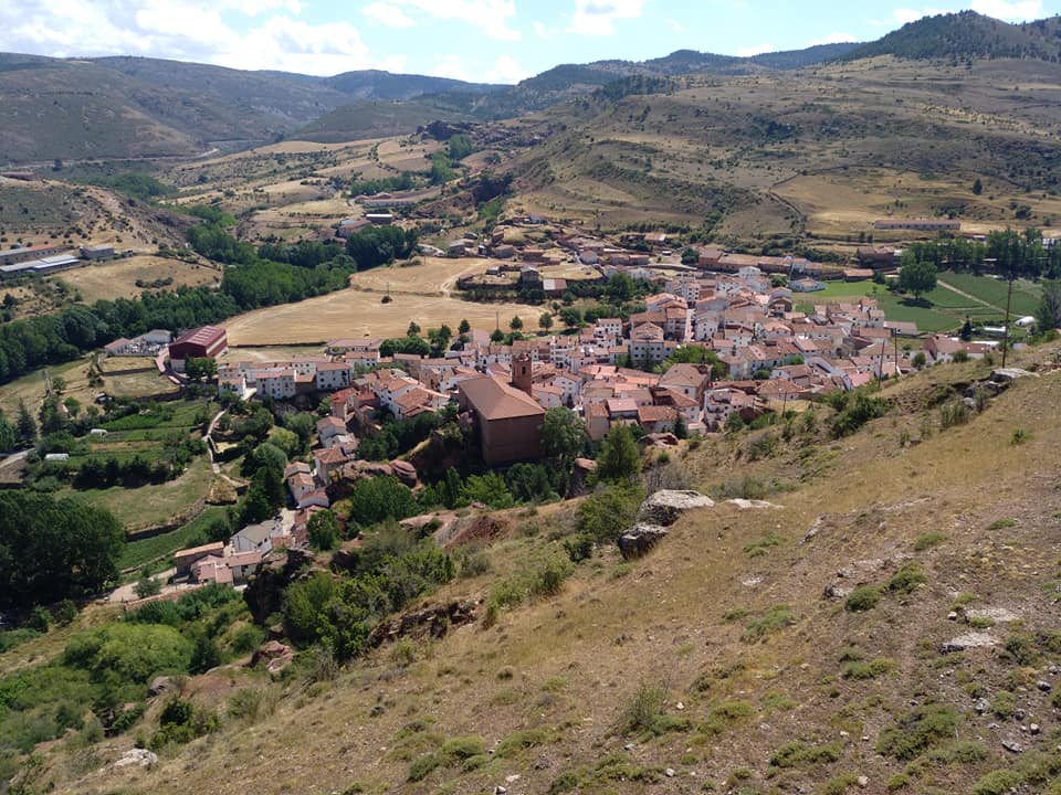 Realizamos primero un descenso hasta llegar a la confluencia con un arroyo, donde giramos a la izquierda para seguir primero un camino, que abandonaremos pronto para seguir el sendero que sale a nuestra derecha, por el cuál ascendemos hasta La Loma de las Puntarrejas (1519) la cual atravesamos en dirección suroeste, para descender por un sinuoso sendero de montaña hasta el Barranco de Checa (1400), y posteriormente ascender hasta llegar al Camino de Rigurrán, el cual seguiremos en dirección en un descenso de unos 200 metros de altitud, hasta llegar a Peralejos de las Truchas. El descenso nos ofrece maravillosas vistas de Peralejos y los parajes que lo rodean: Pico del Moreno, a su espalda; El Machorro, Quinto Majaleche, Riscos de la Ceja, y El Estrecho del Horcajo, a nuestra izquierda. Vistas que nos deleitan y nos muestran parte de lo que vamos a descubrir a partir de mañana. Llegamos a Peralejos de las Truchas, después de 29 kilómetros, y tras dejar las mochilas en la Fonda, visitamos el súper en busca de cinta americana y pegamento que nos ayuden a solventar un pequeño problema con el calzado, solo encontramos pegamento, pero nos es muy útil.